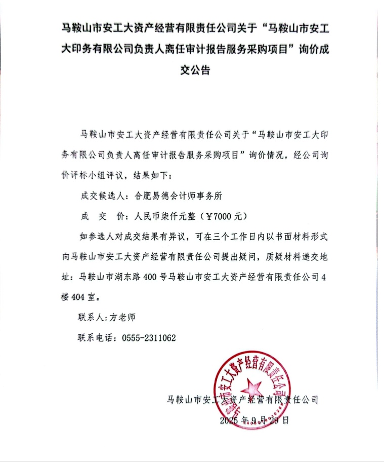 马鞍山市安工大资产经营有限责任公司关于“马鞍山市安工大印务有限公司负责人离任审计报告服务采购项目”询价成交公告