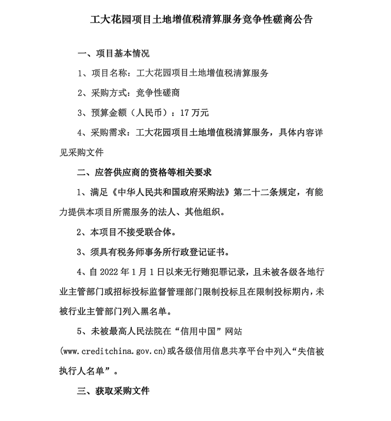 工大花园项目土地增值税清算服务竞争性磋商公告